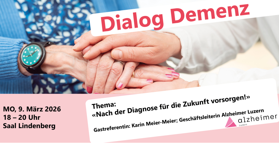 Im Dialog Demenz wird Raum geboten, in dem wichtige Themen rund um die Demenz besprochen werden. Hier können Erfahrungen und Kenntnisse ausgetauscht und neue Perspektiven gewonnen werden. Am 9. März wird Karin Meier-Meier, Geschäftsleiterin von Alzheimer Luzern, einen Vortrag zum Thema „Nach der Diagnose für die Zukunft vorsorgen“ halten. Sie wird aufzeigen, wie wichtige organisatorische und rechtliche Vorkehrungen getroffen werden können, um Menschen mit Demenz und ihre Angehörigen in der Zukunft zu unterstützen.